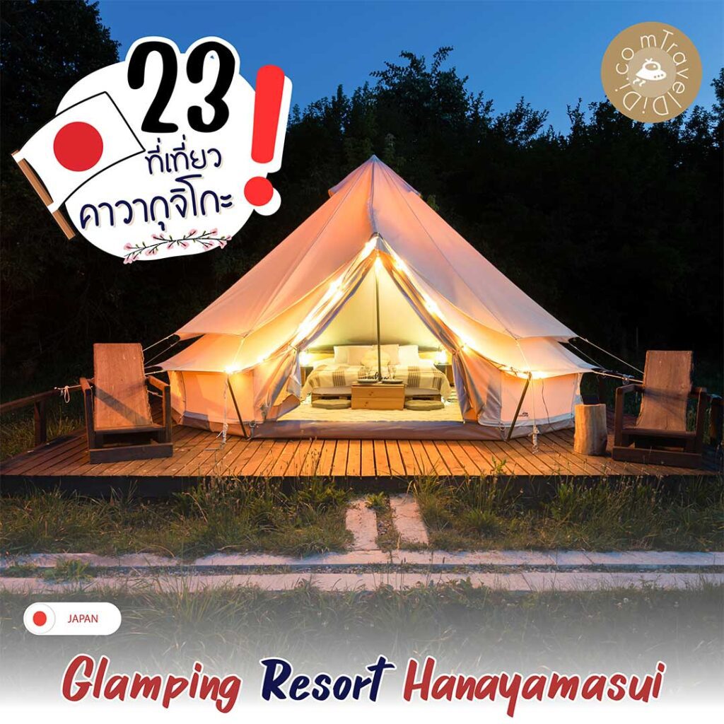 Glamping Resort Hanayamasui เป็นสถานที่ท่องเที่ยวยอดนิยมในจังหวัดเกียวโต ประเทศญี่ปุ่น ตั้งอยู่ริมหุบเขาที่อุดมไปด้วยธรรมชาติ เดินทางโดยรถยนต์ประมาณ 20 นาทีจากสถานี Yoro Keikoku