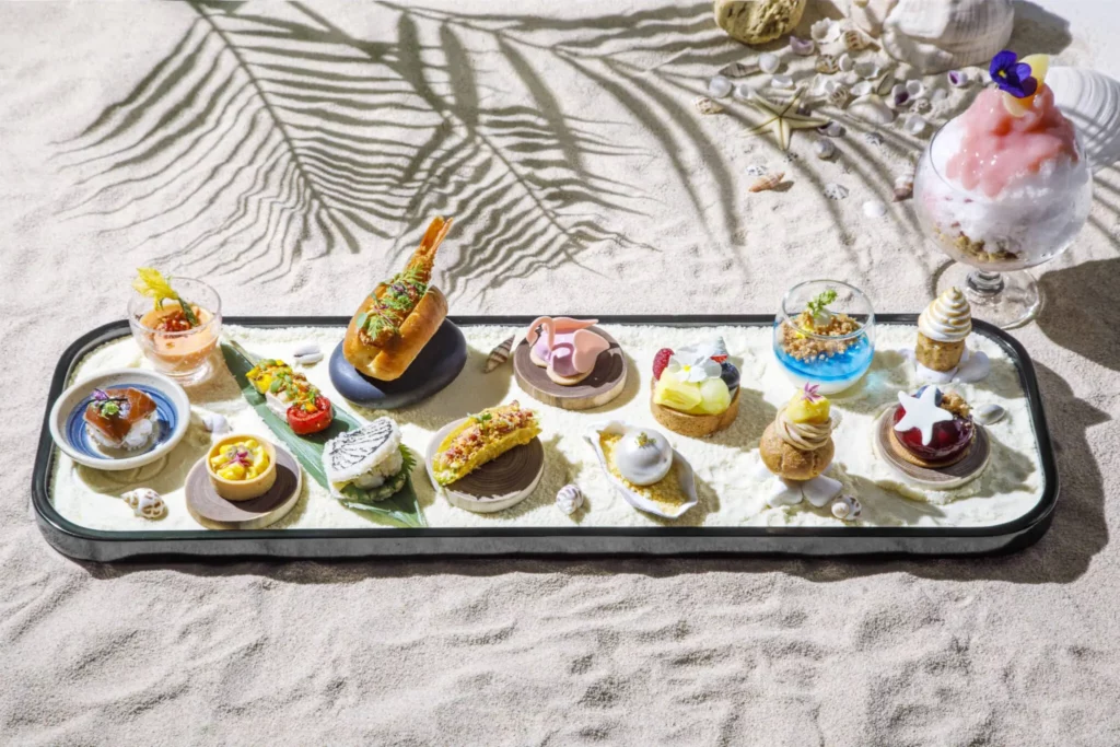 นำชายหาดมาสู่ใจกลางกรุงโตเกียว ชุดน้ำชายามบ่ายซิกเนเจอร์ประจำฤดูร้อนปี 2023 ของ The Peak Lounge เต็มไปด้วยการสร้างสรรค์อันน่ารื่นรมย์ที่สร้างสรรค์โดย Executive Pastry Chef Julien Perrinet และทีมของเขา เช่น เค้กวานิลลาและสตรอเบอร์รี่ที่มีรูปร่างเป็นทุ่นฟลามิงโก มูสราดด้วยไวท์ช็อกโกแลตรูปดาวทะเล และครีมช็อกโกแลตไข่มุกในหอยนางรมที่สวยงาม ปิดท้ายด้วยน้ำแข็งไสผสมลูกพีชแสนสดชื่น เหมาะสำหรับวันฤดูร้อน